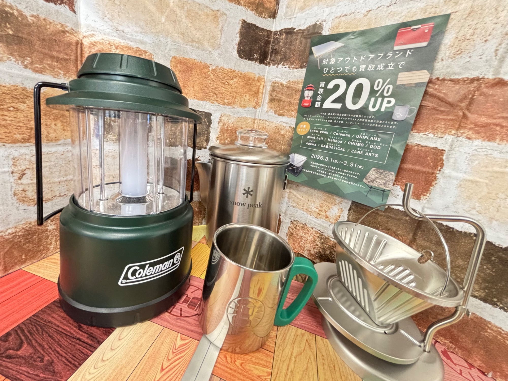 3月はアウトドアブランド買取20%UPキャンペーン!スノーピーク、コールマン、ユニフレームなどのアウトドアブランドはぜひお持ち込みください!