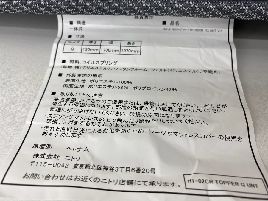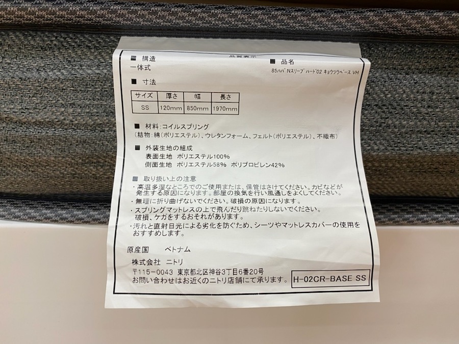 マットレスはNスリープのハードH1-02CRUNT VHと