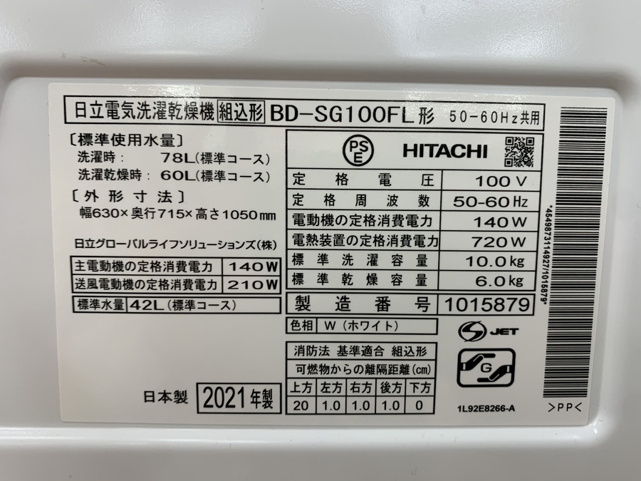 【生活家電買取強化中】HITACHI(ヒタチ) ドラム式洗濯乾燥機 BD-SG100FL 2021年製買取入荷致しました!