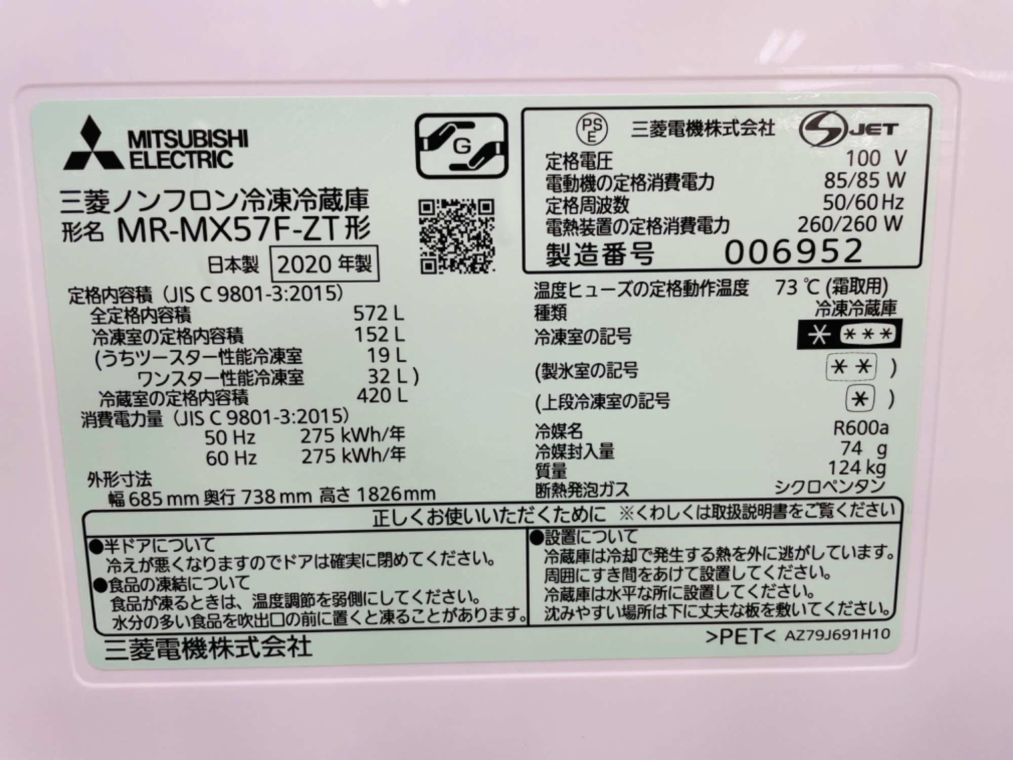 「MITSUBISHI(ミツビシ) 6ドア冷蔵庫 MR-MX57F-ZT 2020年製」