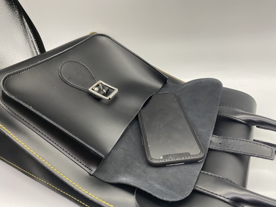 正面のポケットは幅24cm程あるため、スマートフォンや