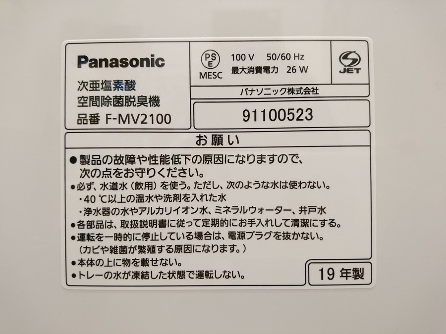 【スマホで購入】Panasonic(パナソニック)次亜塩素酸 空間除菌脱臭機(F-MV2100)が買取入荷致しました!【二俣川店】
