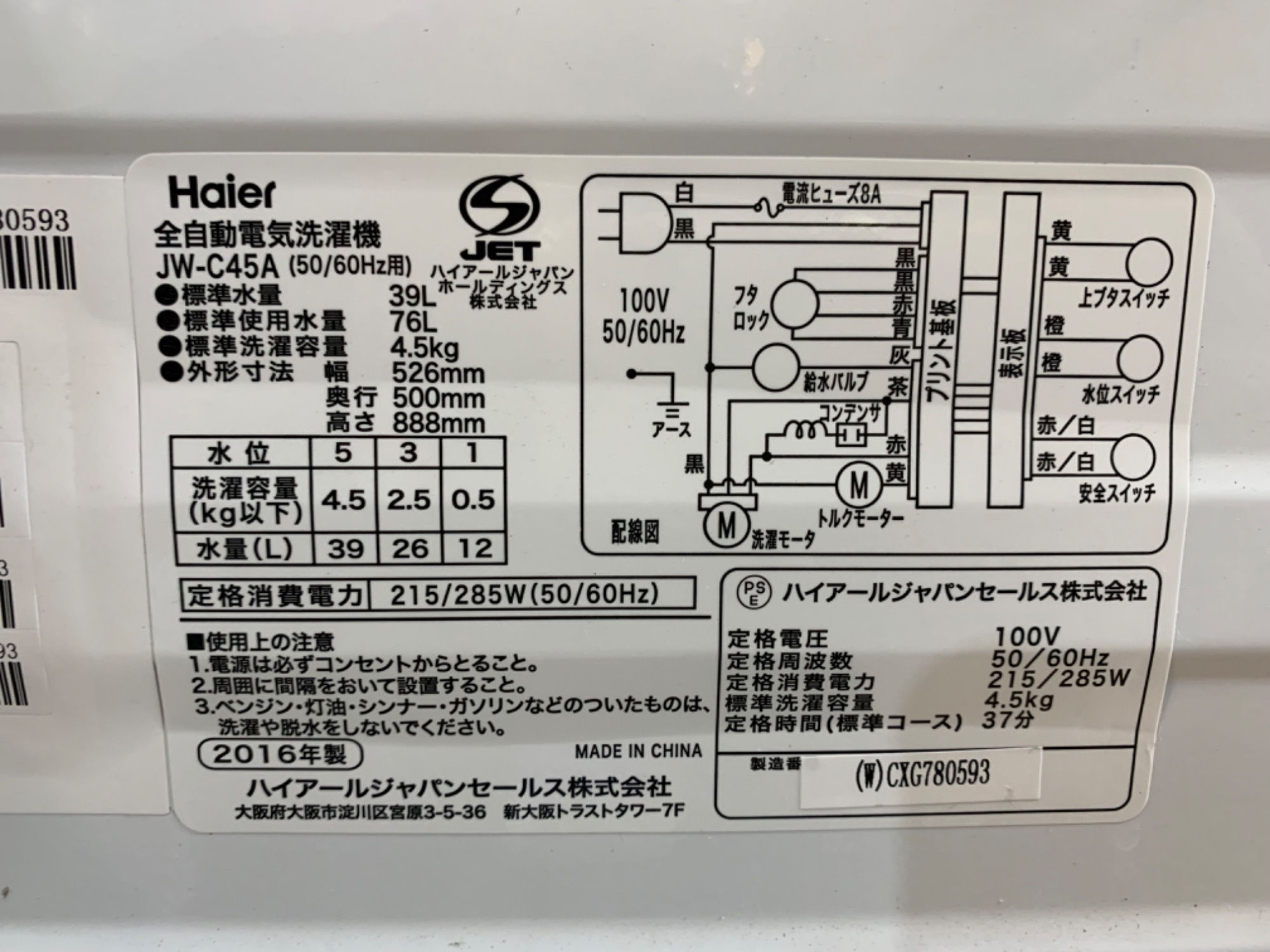Haier(ハイアール)の全自動洗濯機『JW-C45A』2016年製4.5kg販売中!