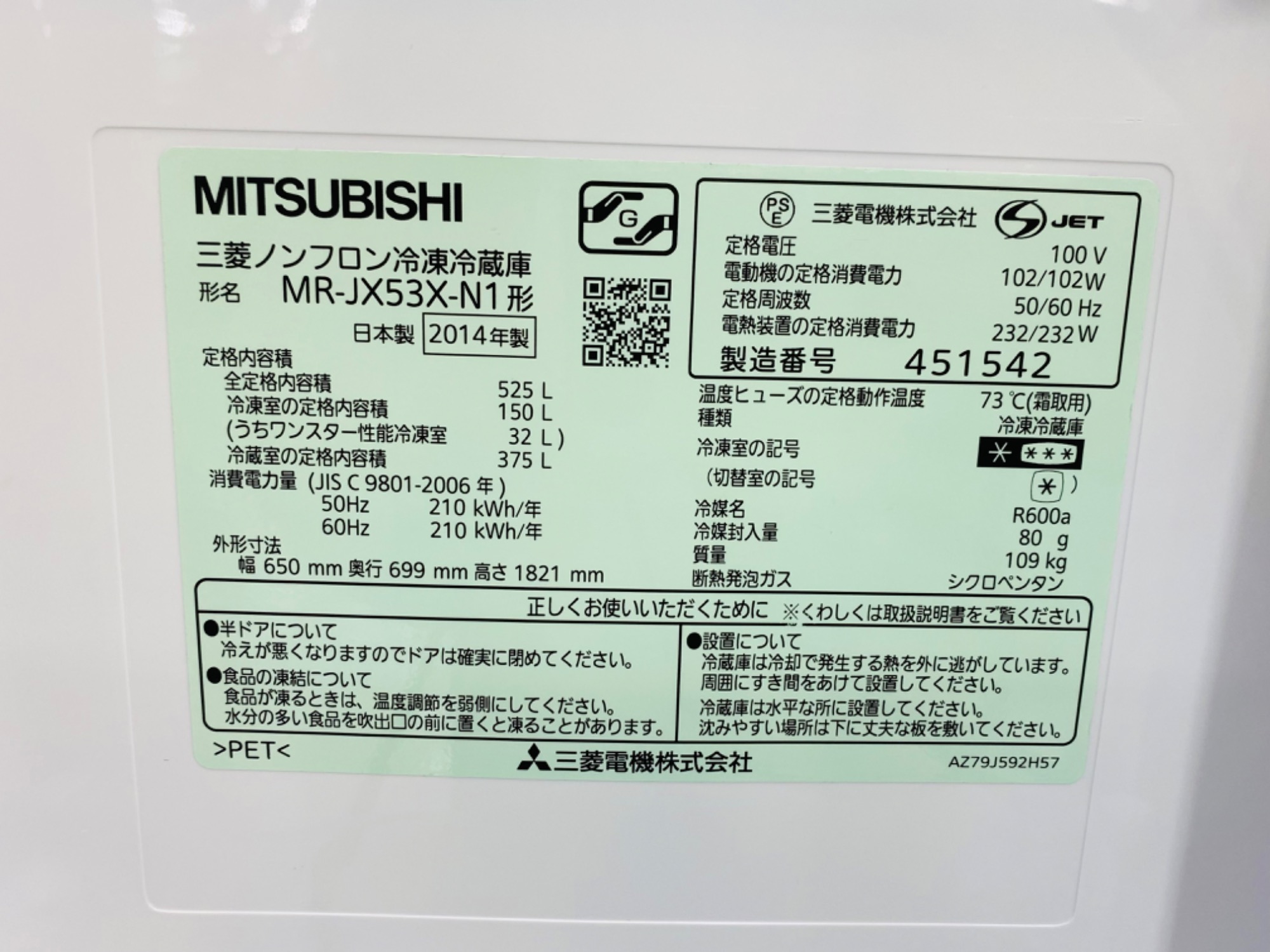 MITSUBISHI(三菱) 6ドア冷蔵庫 MR-JX53X-N1 2014年製が買取入荷致しました!!