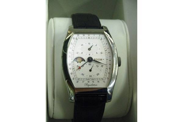 手巻きで、レギュレーター、ムーンフェイズ表示機構がついた、クラシカルな雰囲気のトノー型がとても上品なデザインです。