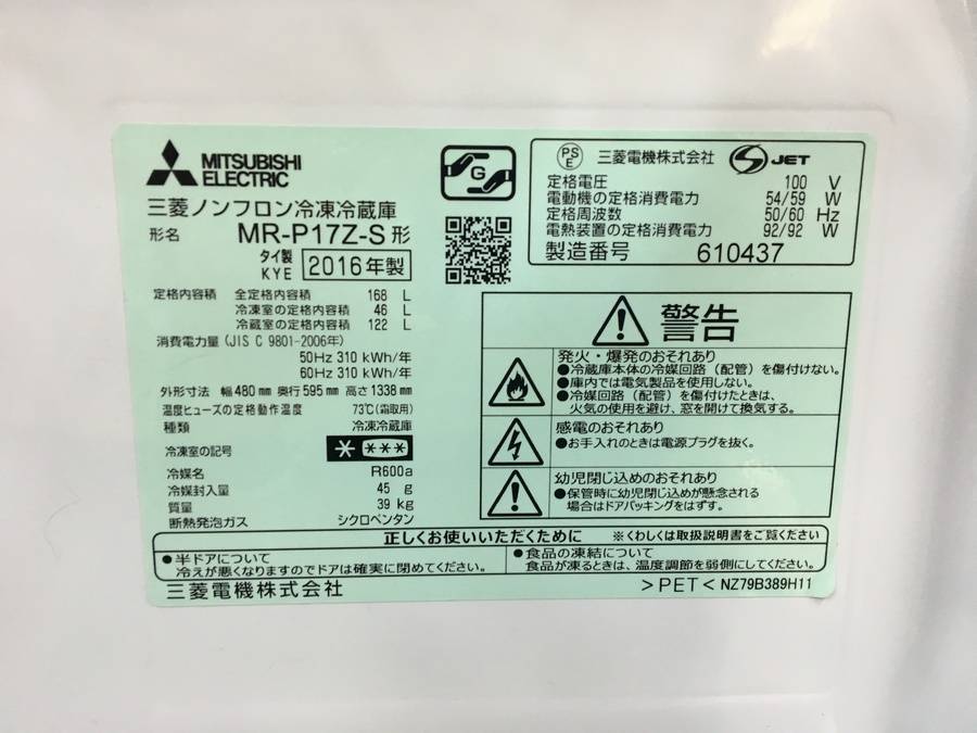 MITSUBISHI  2ドア冷蔵庫 168L MR-P17Z-S