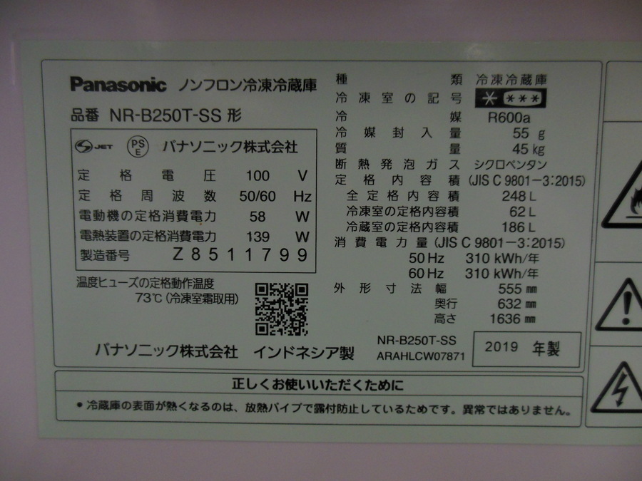 「Panasonic(パナソニック) 2ドア冷蔵庫 2019年製 NR-B250T-SS 248L」入荷!!【大宮店】