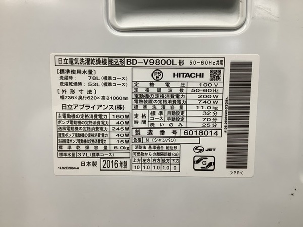 商品名 :HITACHI(日立) ドラム式洗濯機 2016年製 BD-V9800L 11.0kg