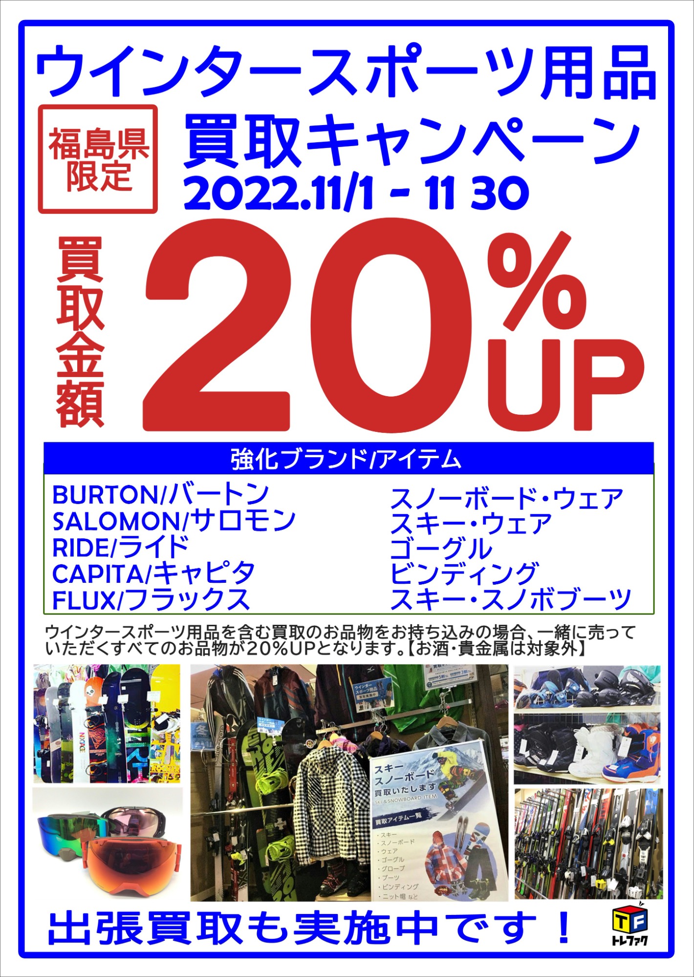 スキー・スノーボード等、ウィンタースポーツ用品の買取りを強化しています! ウィンタースポーツに関するアイテムをお持ち頂くと、一緒にお持ち頂いたお品物も全て20%UPの高額買い取り! 板やブーツだけでなく、ブーツやウェア、グローブやゴーグル、小物類に至るまで、新シーズンに向けて買い替えをお考えの方、引退されてお使いになっていないギアをお持ちの方は、ぜひ当店までお持ちください。 福島県内の店舗だけの期間限定キャンペーンになりますので、買取りの際はお早めに!!