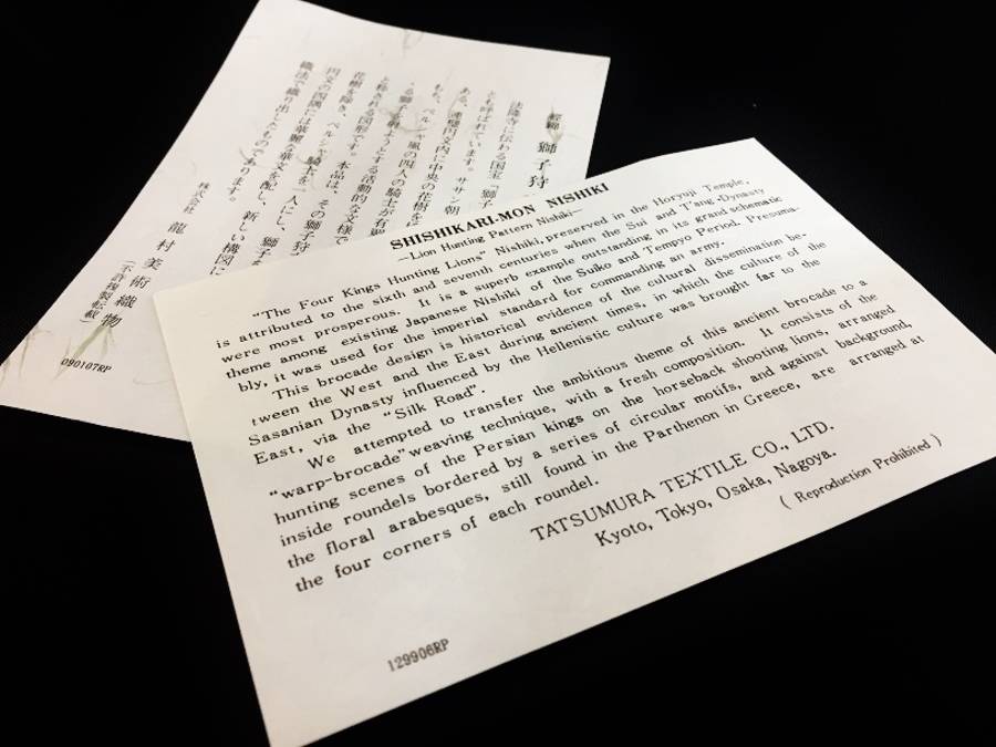 こちらの模様は獅子狩文錦と言われ、ペルシャ風の四人の騎士が、飛びかかる獅子を