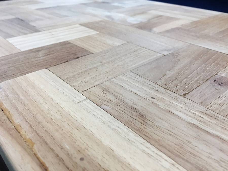 素材はチーク材を利用しており、木材をタイルのようにつなぎ合わせたデザインが