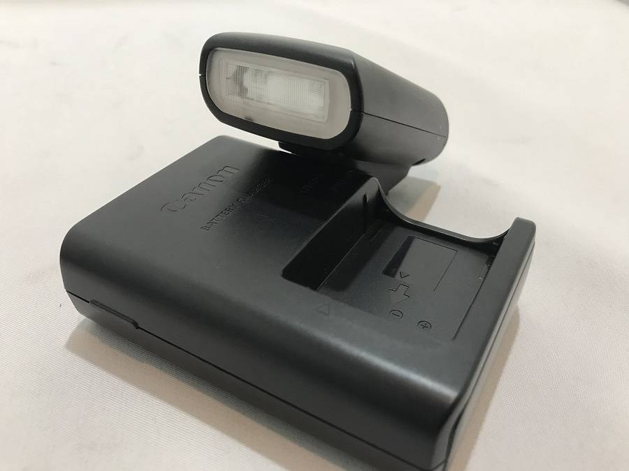 付属品に、EF-M18-55 IS STM レンズキット・充電器・ストロボが付いています。