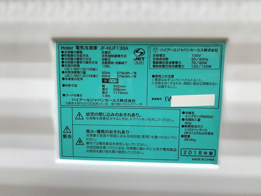2018年製 138L 入荷致しました。 【千葉みつわ台店】