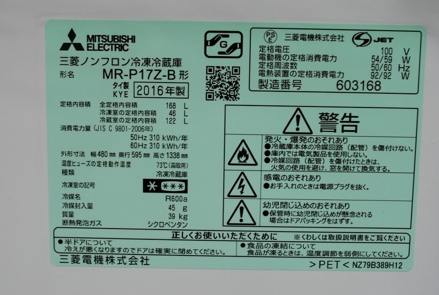 2ドア冷蔵庫 MITSUBISHI(三菱) MR-P17Z-B 2016年製 168L 入荷致しました!【千葉みつわ台店】