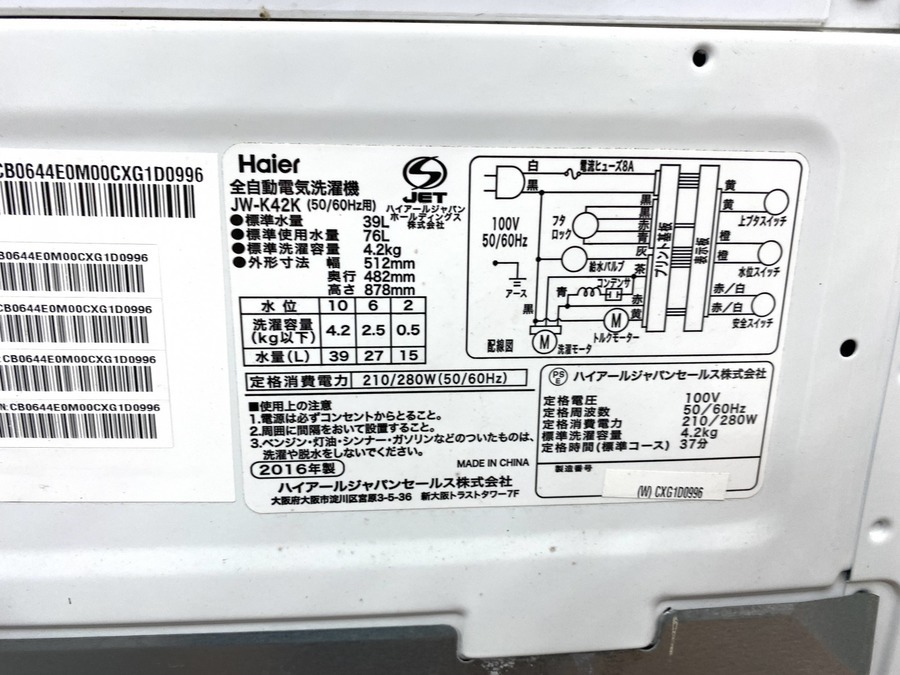 全自動洗濯機 Haier(ハイアール) 4.2kg JW-K42K 2016年製入荷致しました!【千葉みつわ台店】