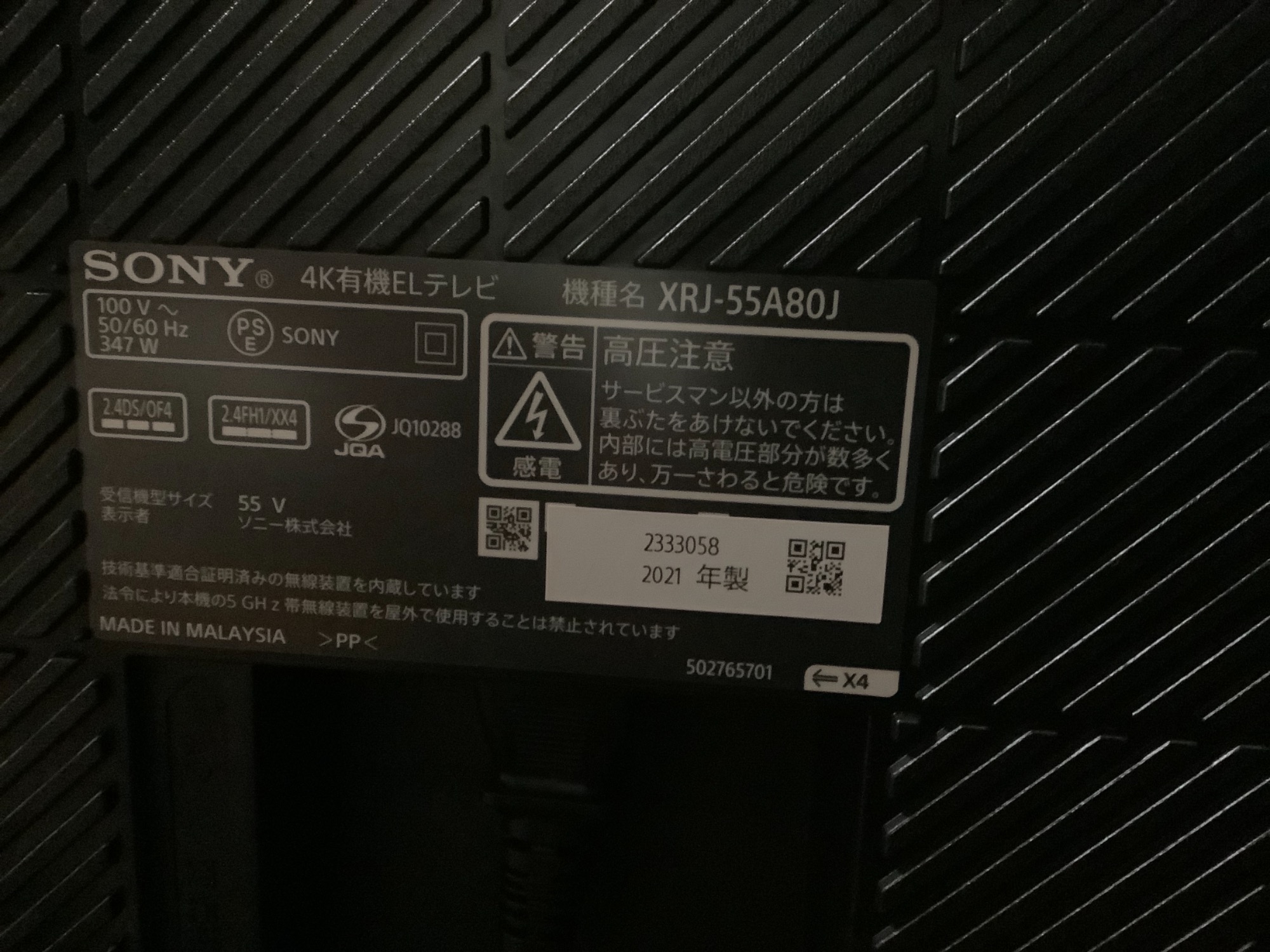 【型番】 :XRJ-55A80J