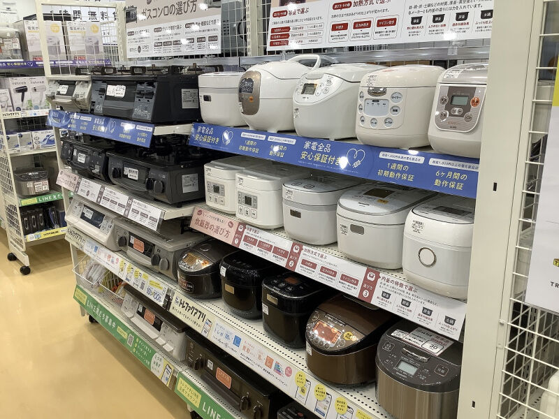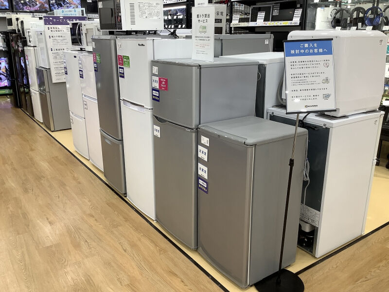 当店では、普段の生活に欠かせない家具や家電を多数取り揃えております。冷蔵庫や洗濯機は単身用からファミリーサイズのものまであり、調理家電や小家電も様々な種類がございます。季節家電やエアコンなどもございますので当店までご来店おまちしております。