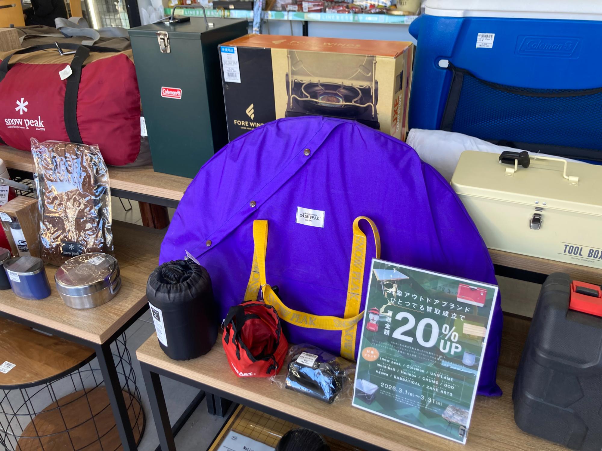 アウトドアブランド買取20%UPキャンペーン!スノーピーク、コールマン、ユニフレームなどのアウトドアブランドはぜひお持ち込みください!