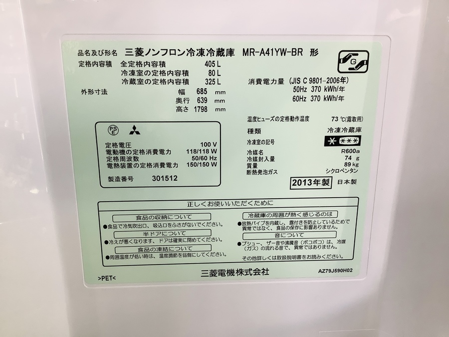 MITSUBISHI 5ドア冷蔵庫 MR-A41YW-BR 入荷致しました!【草加店】