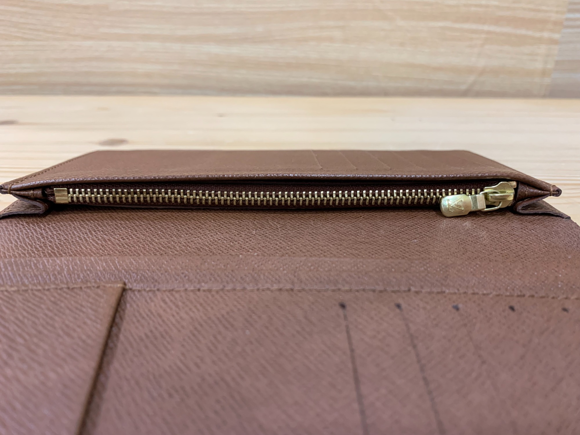二つ折りで薄く収納ポケットも多く使いやすいお品物でございます。
