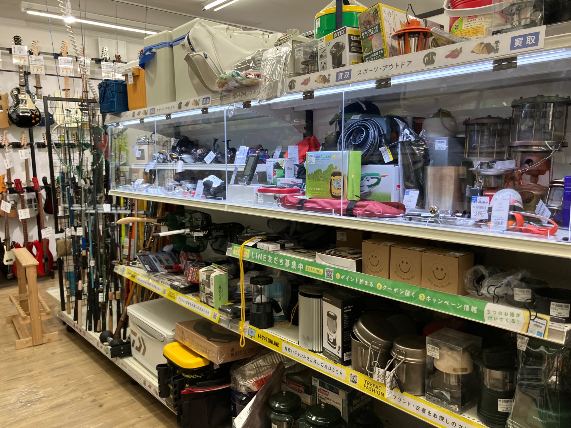釣り具やアウトドア品を入口に展開しておりギターも常時20本以上展示しております。
