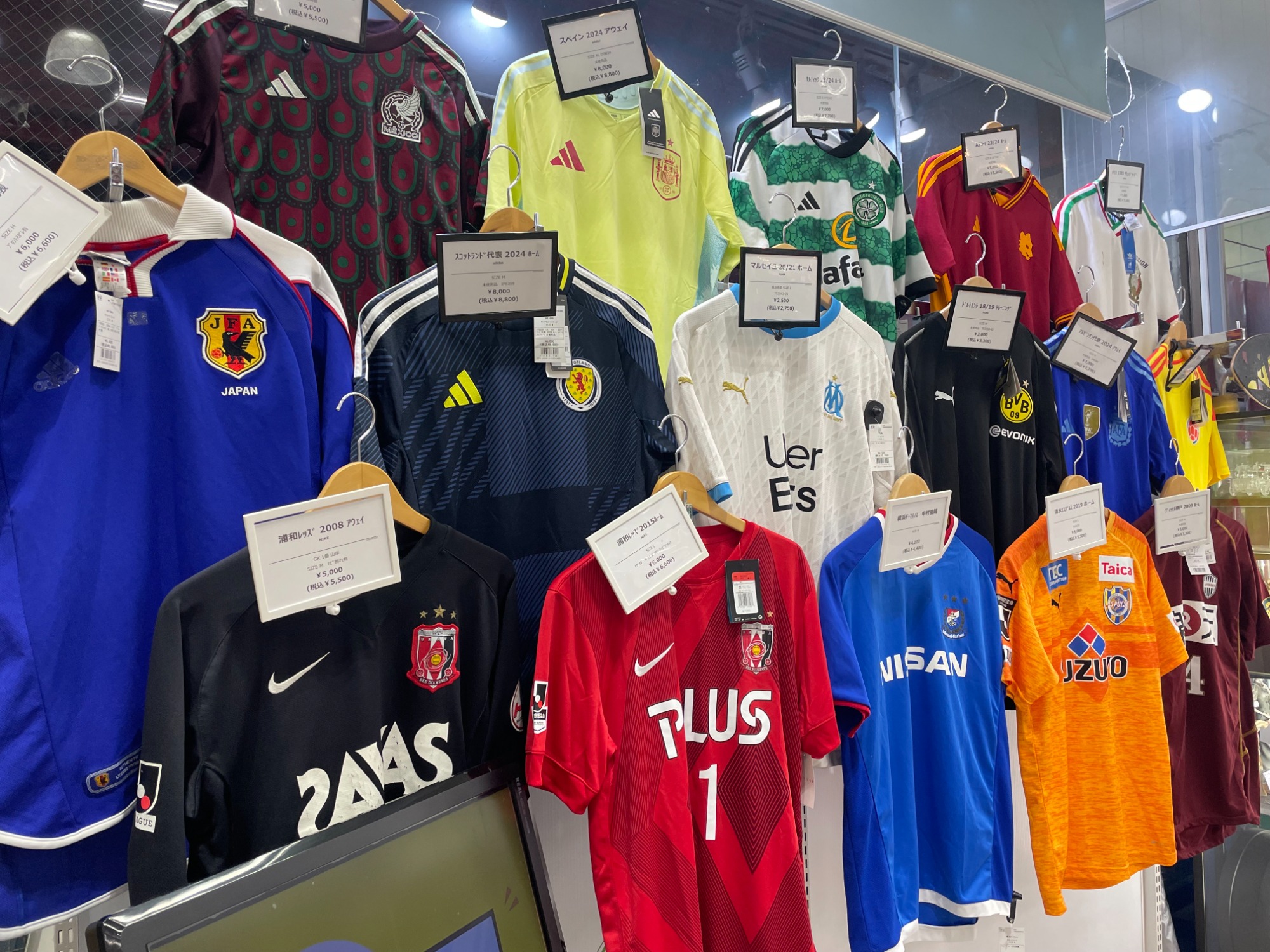 サッカーユニフォームをずらりと壁一面に展示中!