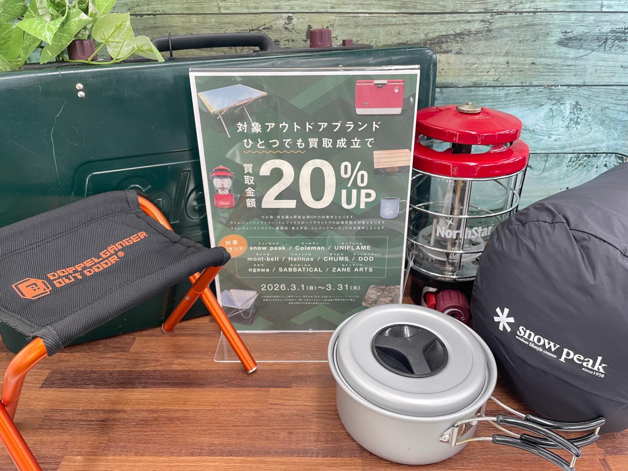 3月は【アウトドアブランド買取20%UPキャンペーン!】スノーピーク、コールマン、ユニフレームなどのアウトドアブランドはぜひお持ち込みください!