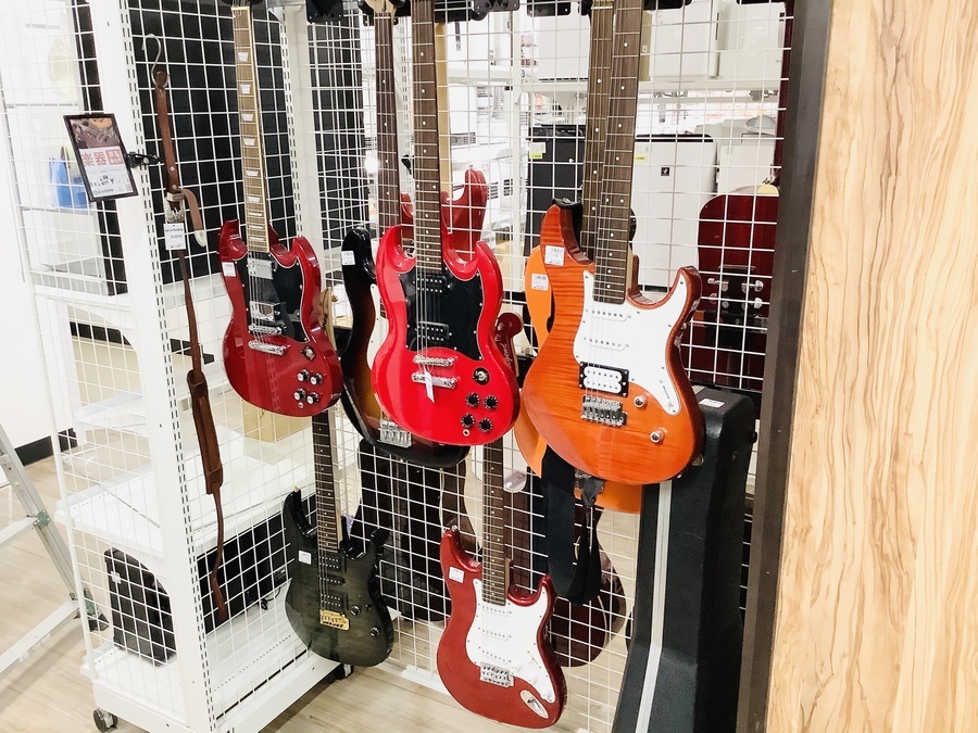 こちらはエレキギター売場です。気軽にお手に取っていただけるよう、吊るしての展示となっております。もちろん、試奏大歓迎です。