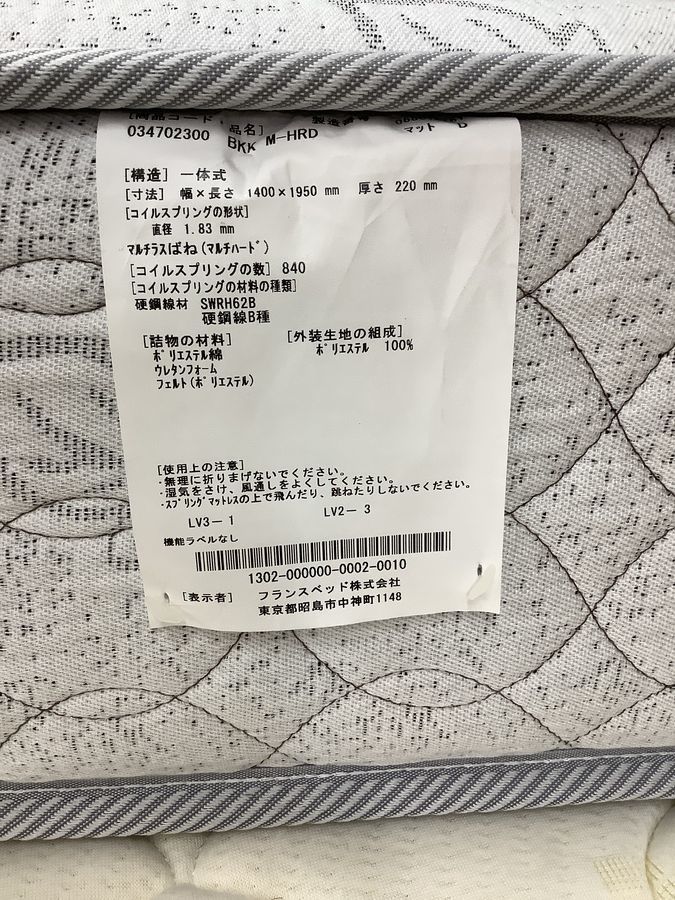 外形寸法:[マットレス]幅・1400mm 奥行き・1950mm 厚さ・220mm
