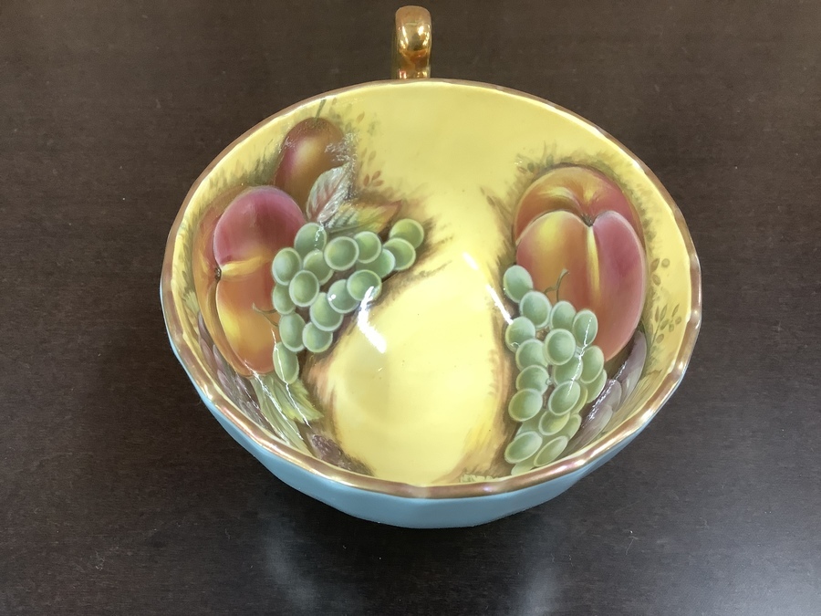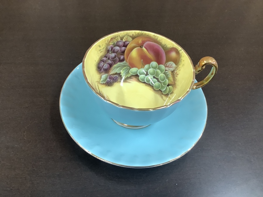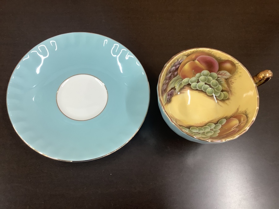 カップ、ソーサー表面のターコイズカラーとカップ内側のフルーツモチーフ