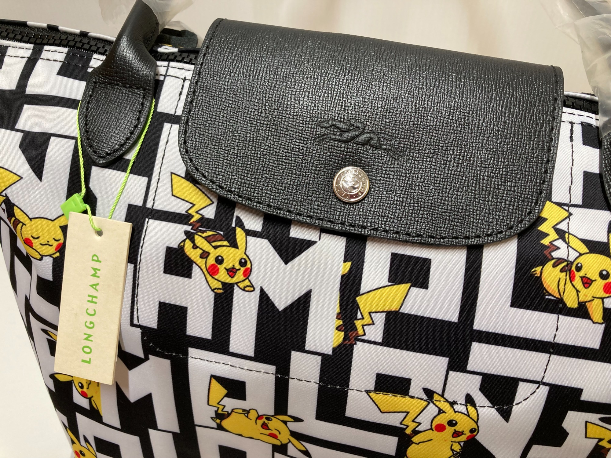 「LONGCHAMP」の9つのアルファベットとピカチュウがデザインされています。