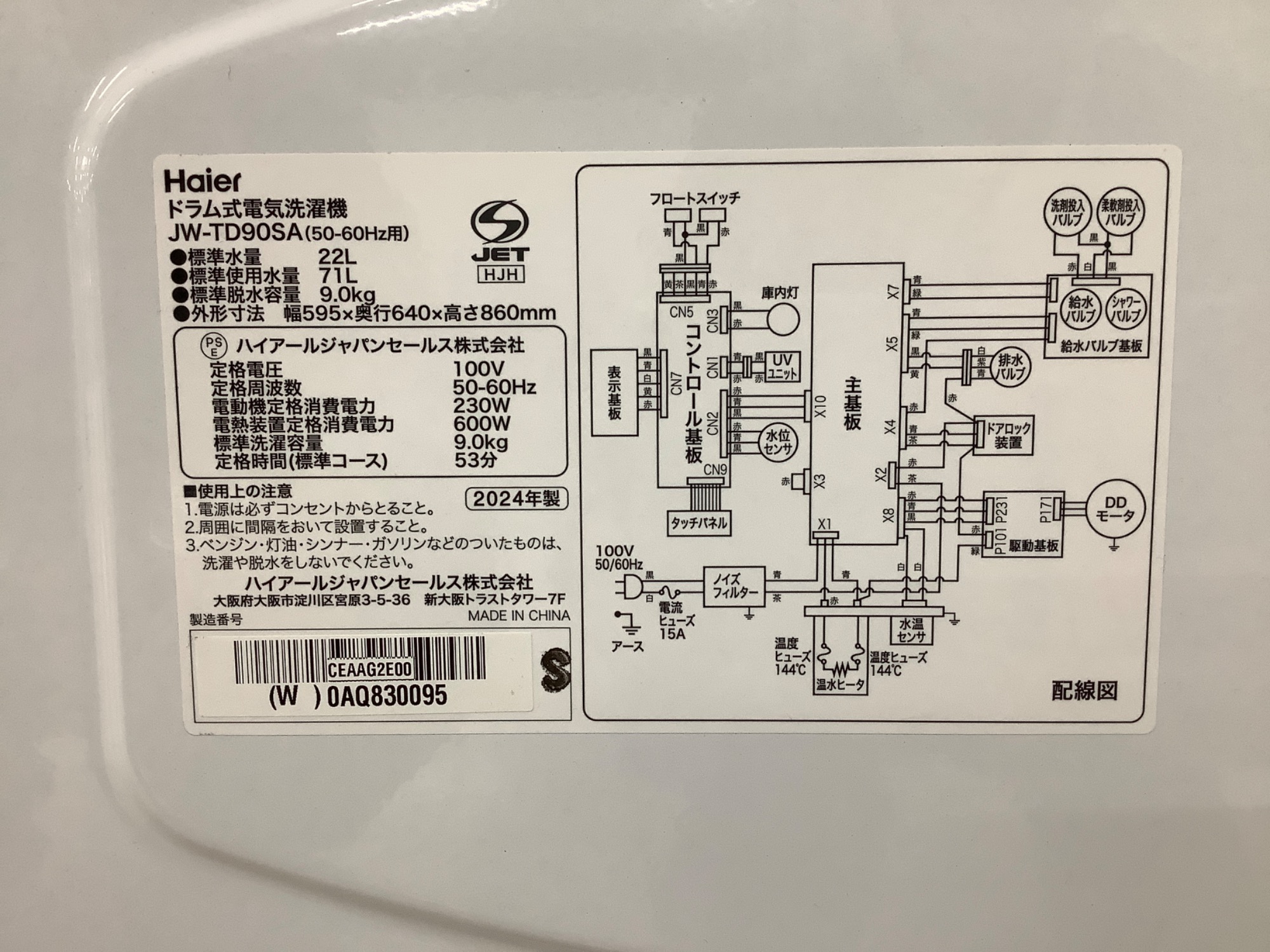 Haier(ハイアール) ドラム型洗濯機 JW-TD90SA 9.0㎏ 2024年製