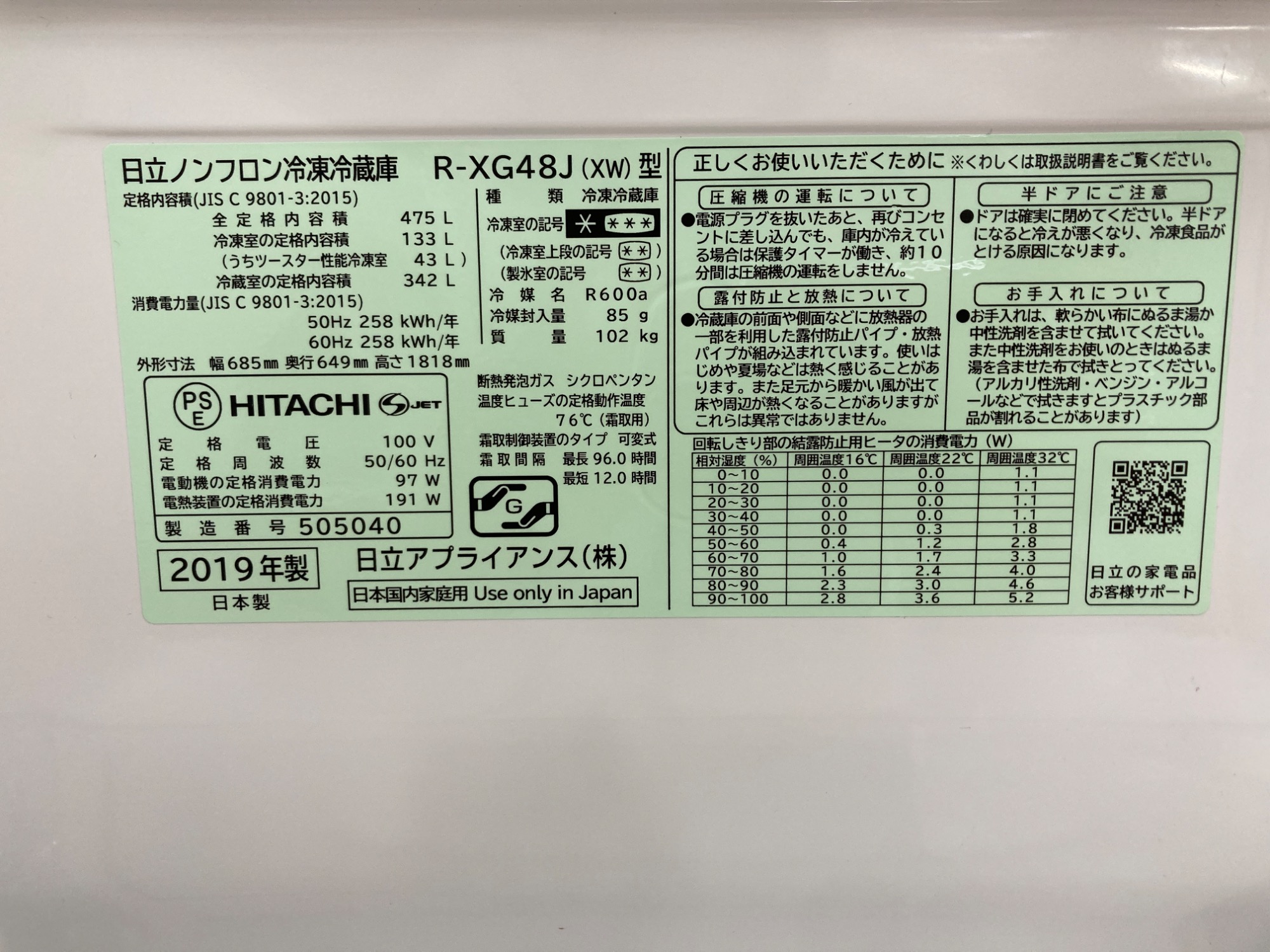 6ドア冷蔵庫 HITACHI R-XG48J(XW) ファン式 2019年製 475Lを買取入荷致しました!
