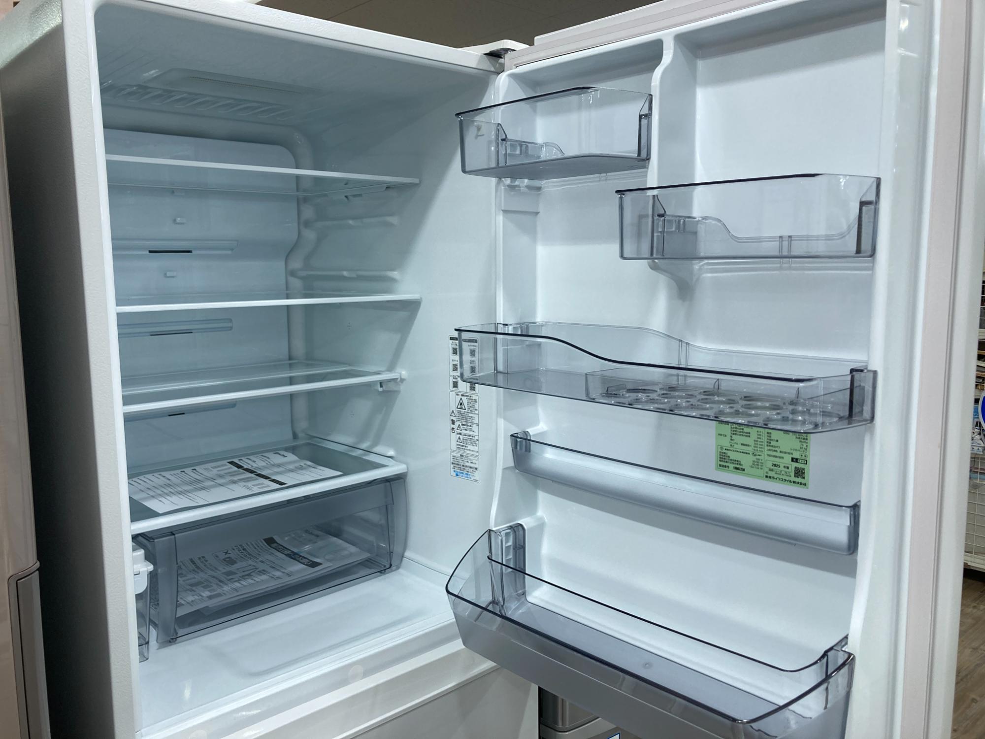今回入荷したのは、東芝の代名詞とも言える人気シリーズ「VEGETA(ベジータ)」の411Lモデルです。幅60cmというスリムなサイズ感でありながら、充実の機能と収納力を備えており、二人暮らしからファミリーまで幅広くおすすめできる一台。自然に馴染む、落ち着いたマットホワイトのカラーリングも魅力です。