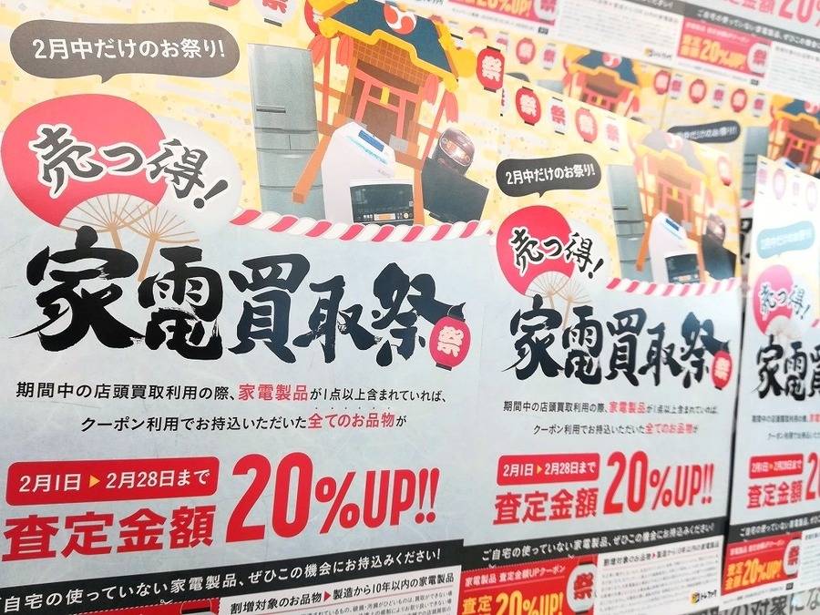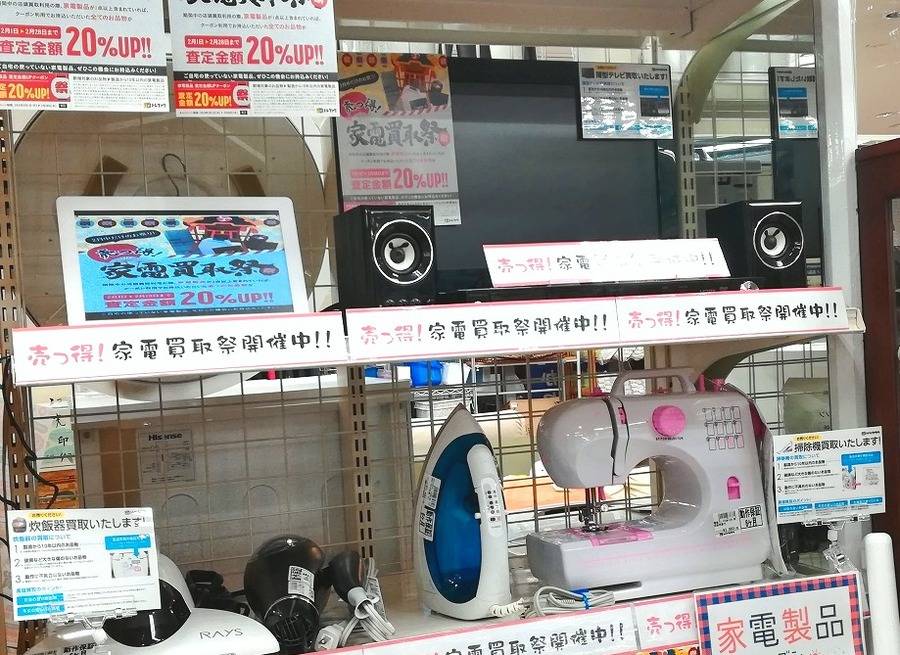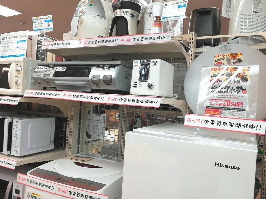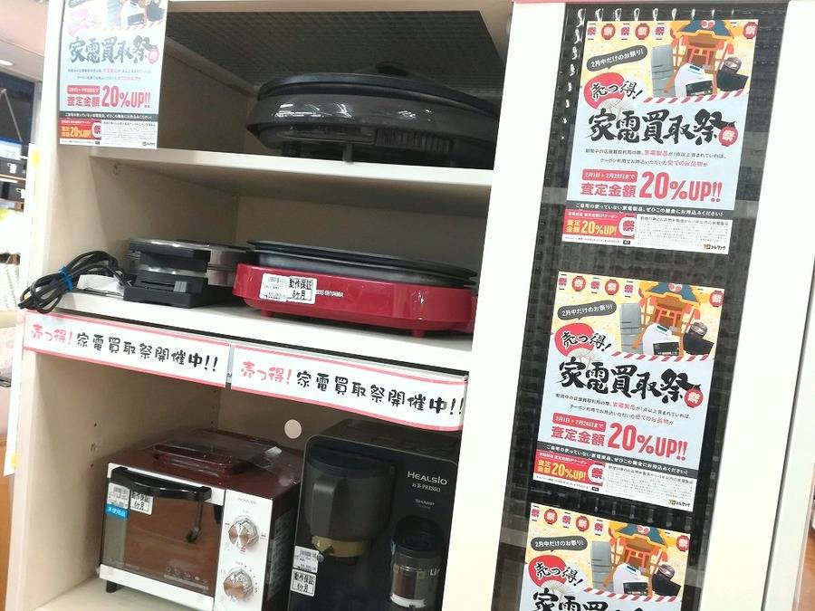 桶川店 店舗TOP 店内紹介 新入荷ブログ 地図・アクセス スタッフ募集 埼玉県桶川市にあるリサイクルショップ 桶川店からの新入荷&買取情報です! 今売っとく?!売っ得!家電買取祭!!【上尾店】 2018-02-02 #生活家電 #買取キャンペーン #家電 #上尾 #祭 こちら公開後3ヶ月以上の記事です。商品の売り切れなど情報が古い場合があります。 ・最新の掘り出し物入荷情報はこちら ・いま店頭で使えるクーポンはこちら ただいまトレジャーファクトリーでは、家電買取祭りを開催中です!!お持ち込みいただいたお品物に対象の家電製品が一点でも含まれていれば、成立したお買取り金額が全て20%UP!!冷蔵庫・洗濯機など大型の物から、液晶テレビや電子レンジなど小さな物まで多数のアイテムが対象となっております♪キャンペーン機関は2月28日まで!お気軽にお持ち込みくださいませ!!*お電話でのお取り置きは承っておりません、ご了承下さい*