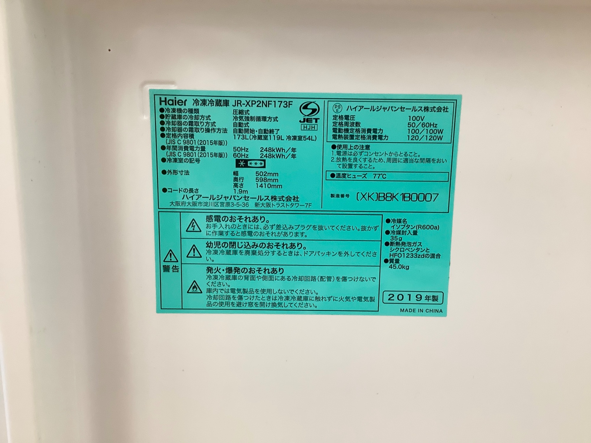 【Haier 2ドア冷蔵庫 2019年製】