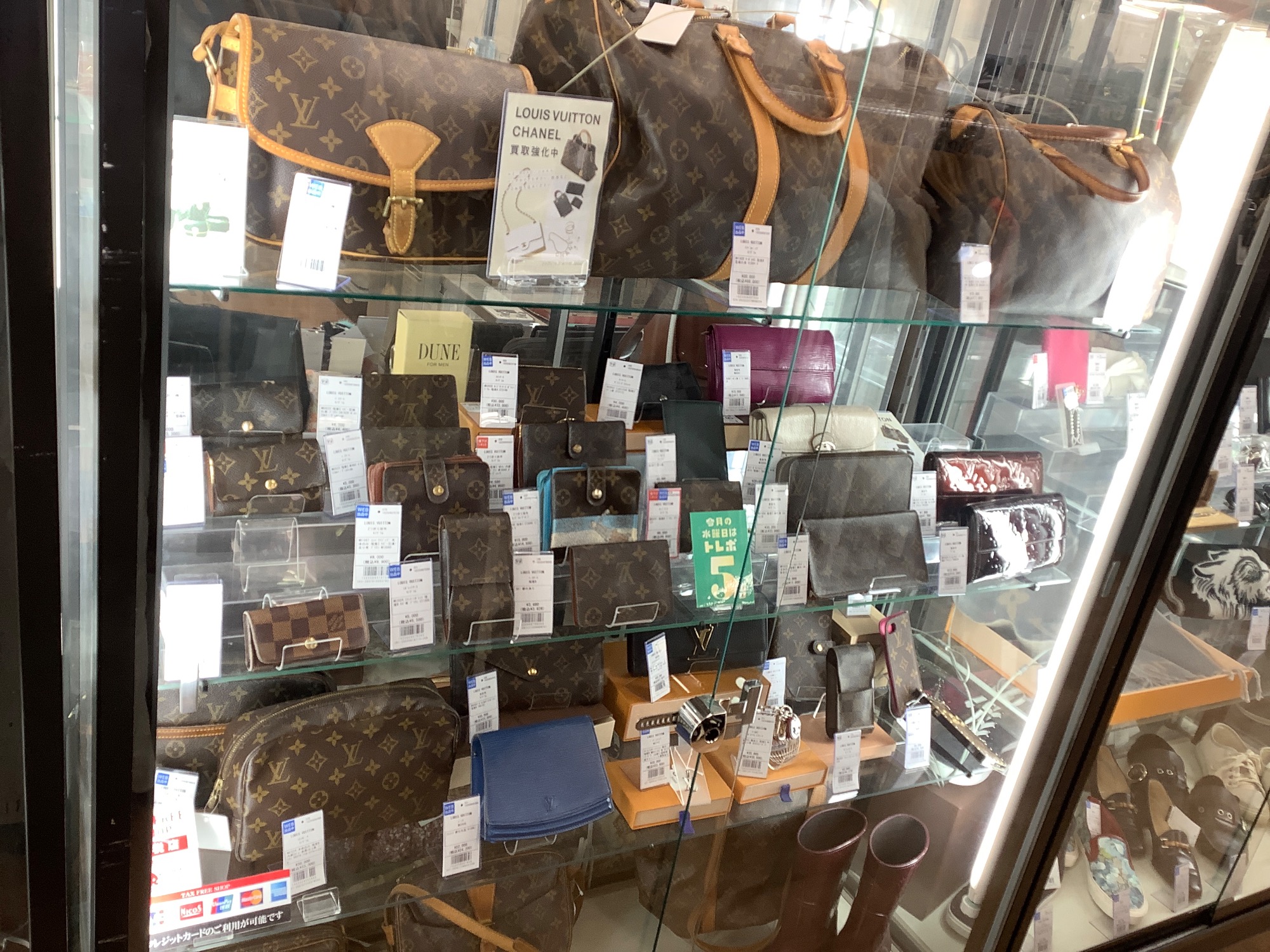 当店のショーケースには他にも多数のバッグ・財布を展示中です。