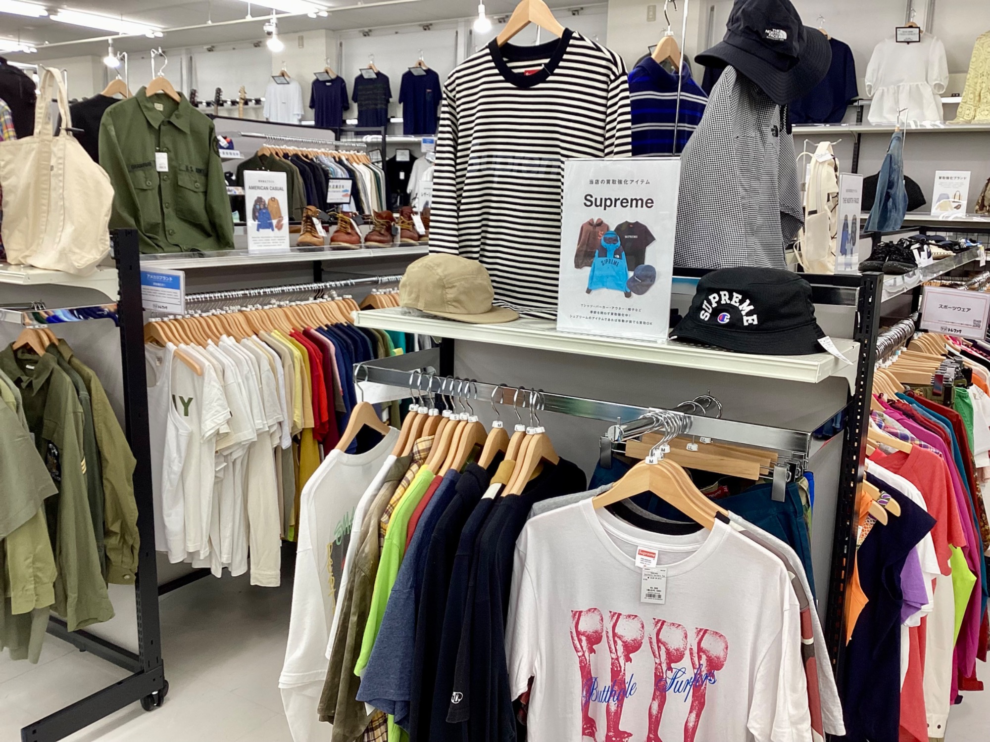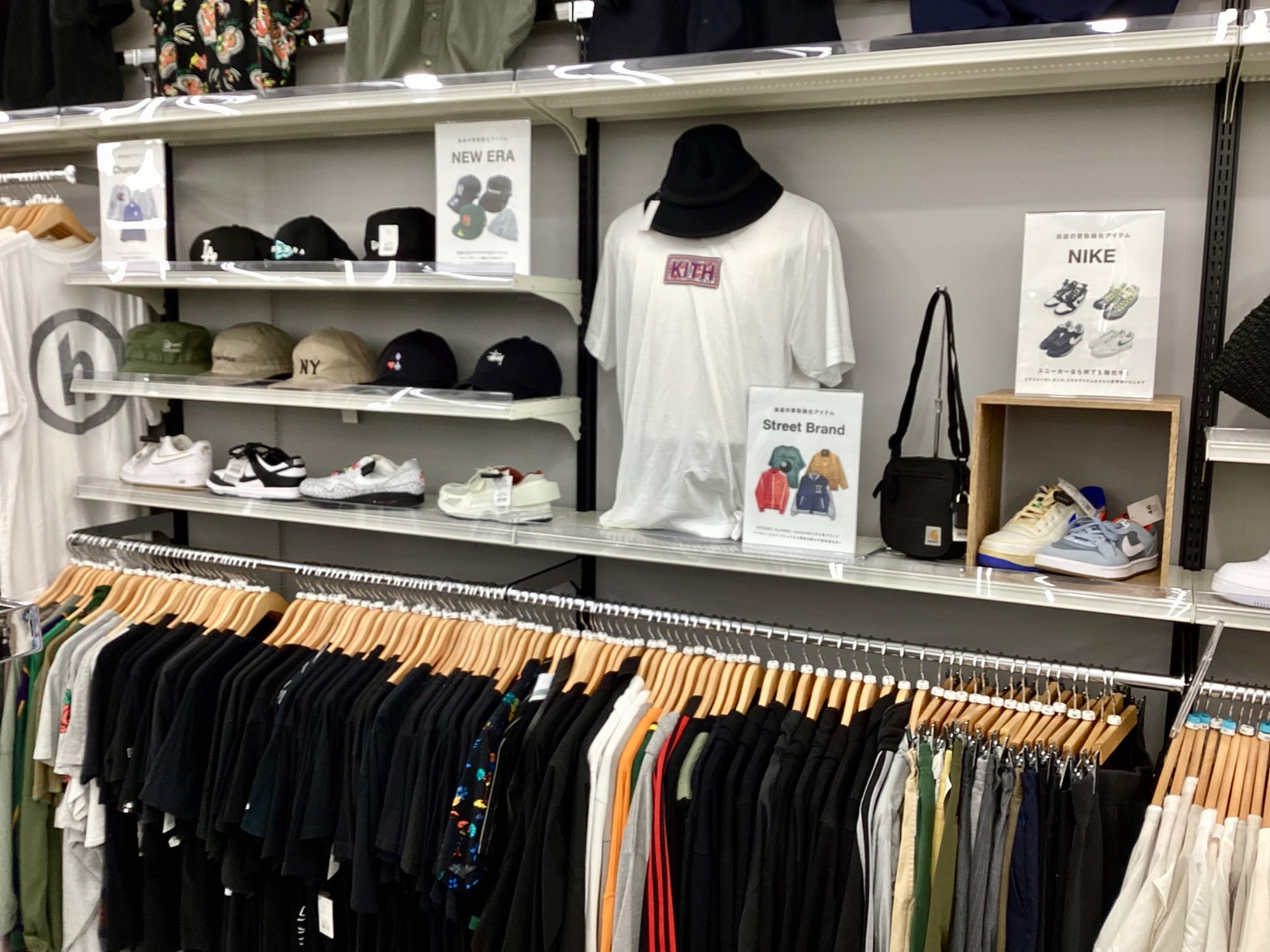 続いては、SupremeやStussy、X-LARGE、Carharttなどを集めたストリート衣類売場になります!