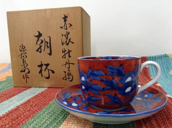 和食器の中でも一流ブランド、源右衛門窯の赤濃牡丹絵朝杯という柄のカップ&ソーサーです。