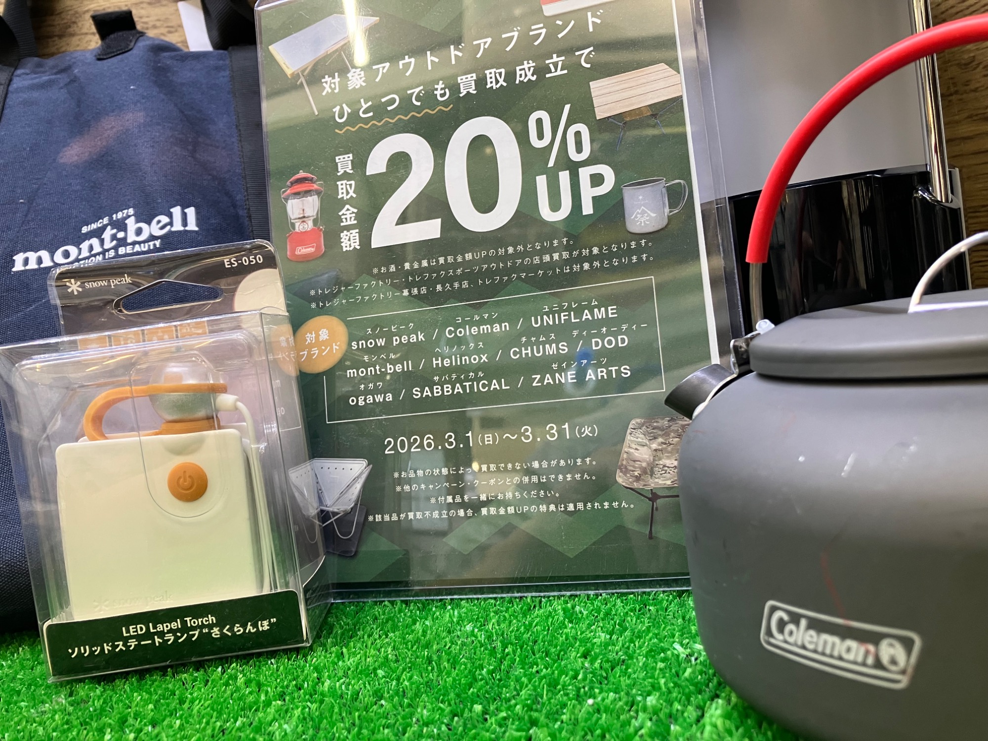 3月はアウトドアブランド買取20%UPキャンペーン!スノーピーク、コールマン、ユニフレームなどのアウトドアブランドはぜひお持ち込みください!