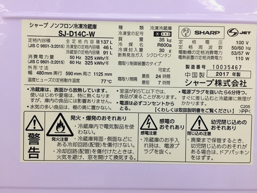 本日は SHARP SJ-D14C-W 2ドア冷蔵庫 のご紹介となります。