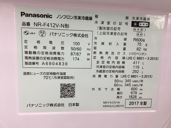本日は 2017年製 Panasonic NR-F412V-N 6ドア冷蔵庫 のご紹介です。