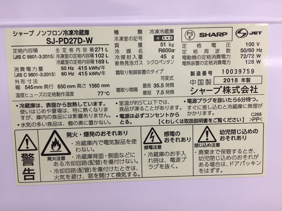 本日は SHARP(シャープ) 2ドア冷蔵庫 2018年製 のご紹介です。