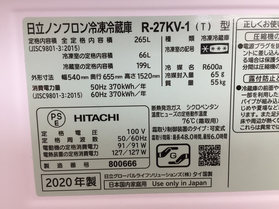 R-27KV-1 2020年製 のご紹介です。