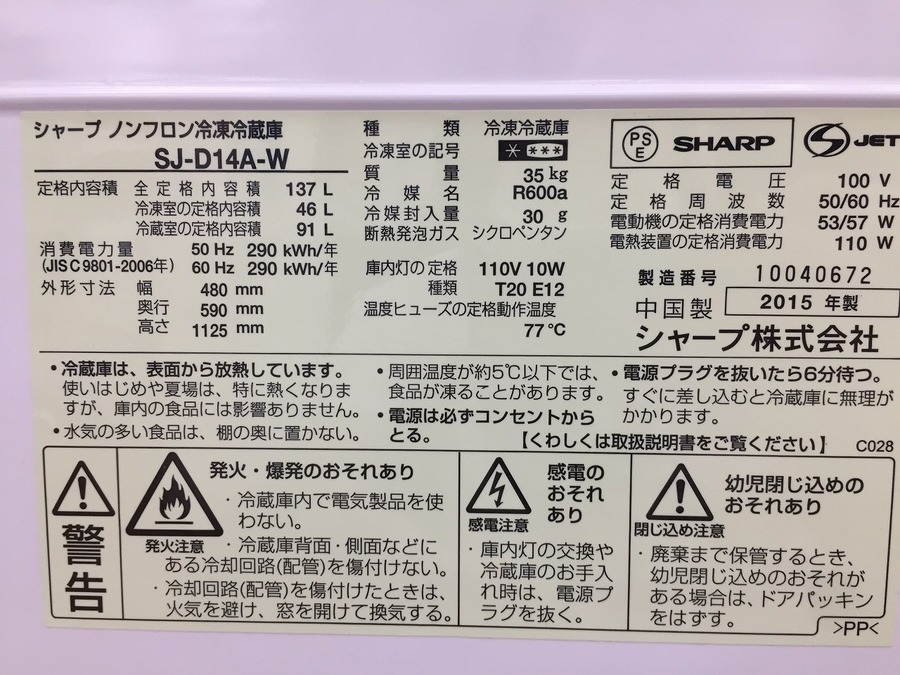 本日はSHARP(シャープ)2ドア冷蔵庫 SJ-D14A-W