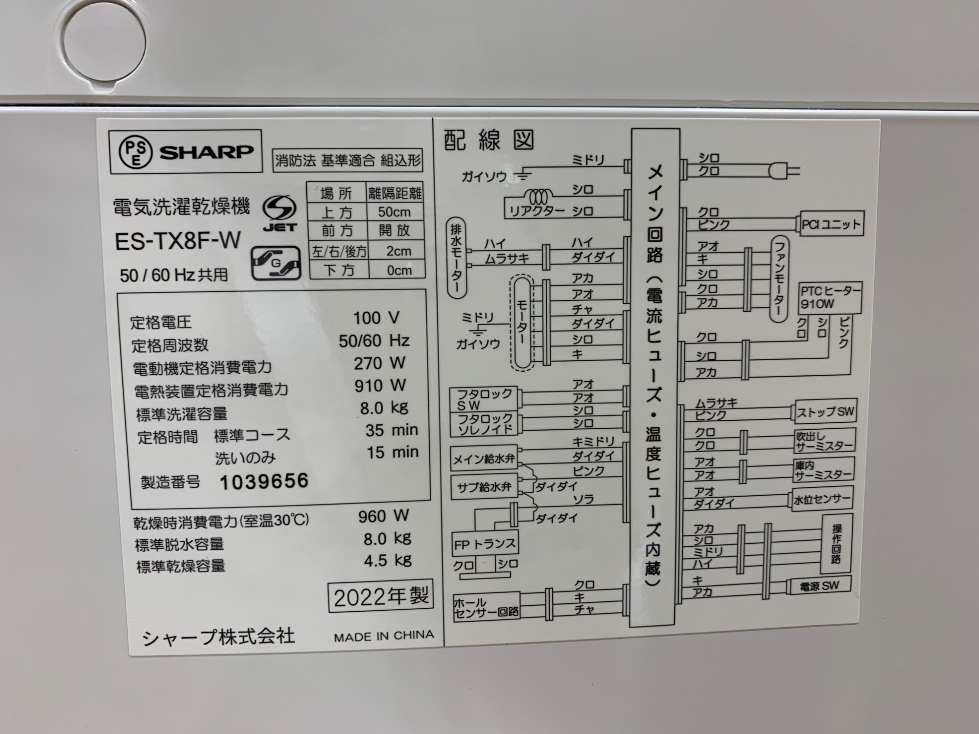 SHARP(シャープ) 8.0kg 電気洗濯乾燥機 ES-TX8F-W 2022年製 ご紹介いたします!