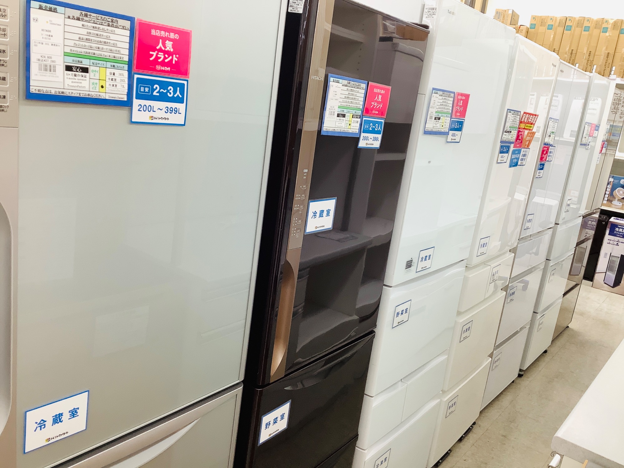 特に3ドア以上の大型冷蔵庫は数量を多めにして販売中です
