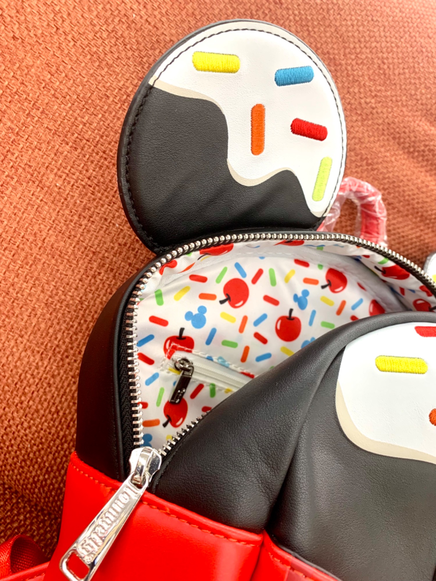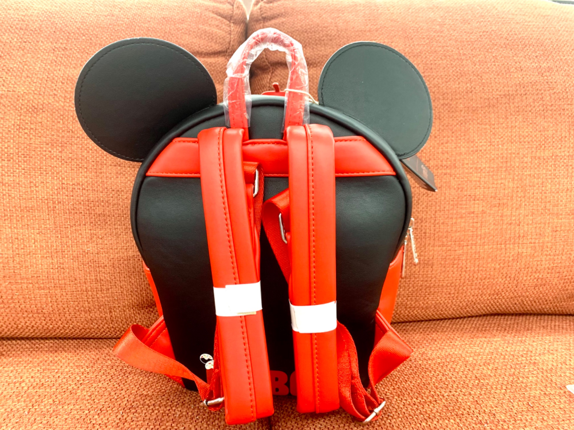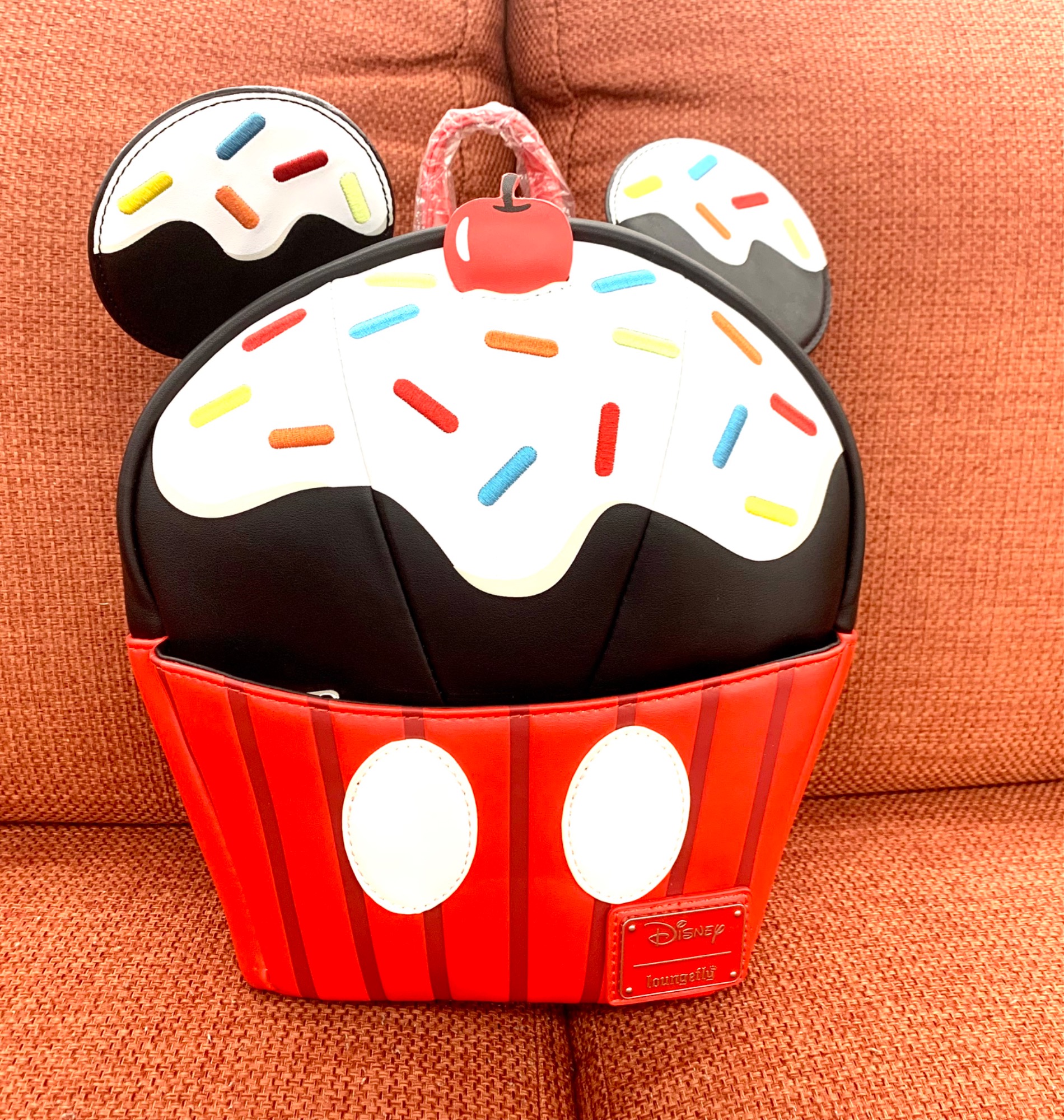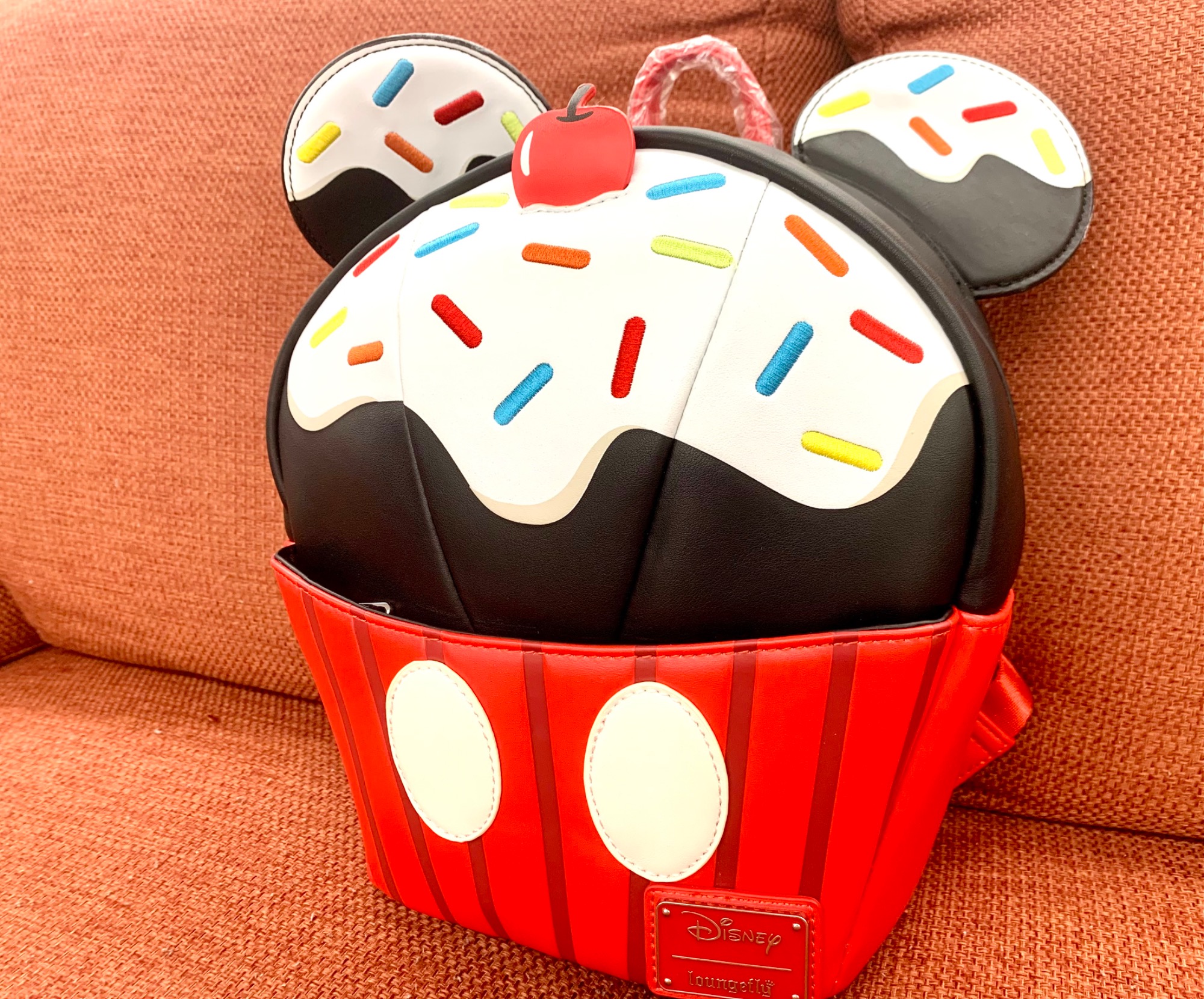 ミッキーマウスのアイコニックな耳とミッキーの有名な衣装を思わせるラッピングが施された、おいしそうなデザート型のバックパックです♪