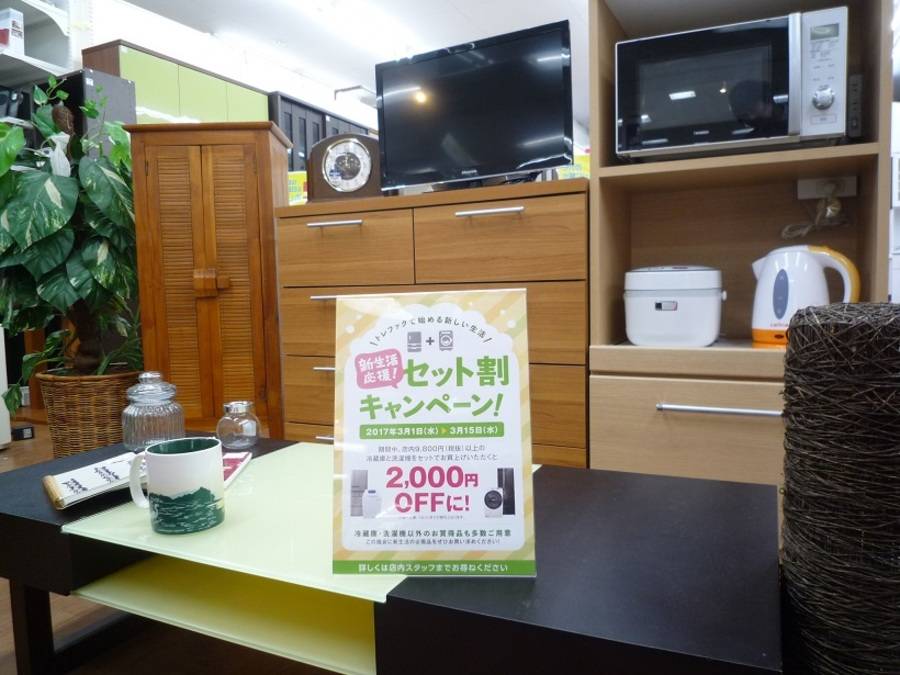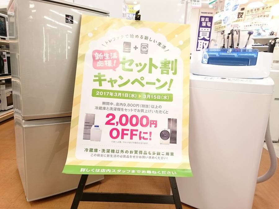 当店ではただいま3月1日から3月15日の間9800円以上の冷蔵庫と洗濯機を一緒にご購入頂きますと・・・・・・