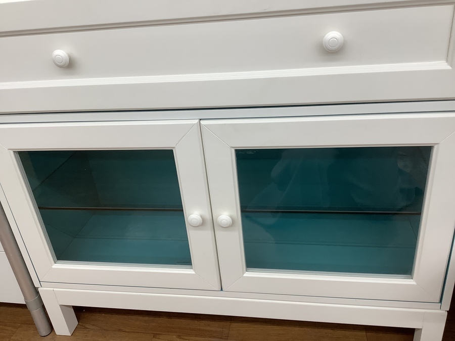 下段ガラス扉の中が目の覚めるようなブルーが特徴的なサイドボードです!